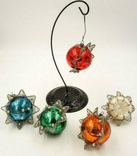 5 Vintage Wire Wrapped Glass Christmas Tree Ornaments West German Balls & Tinsel