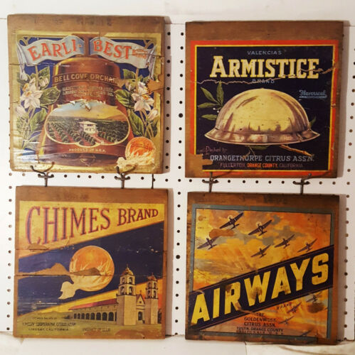 * 4 ORIGINAL WOOD ORANGE CRATE ENDS W/LABELS EARLI-BEST CHIMES ARMISTICE AIRWAYS