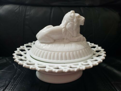Title (ebay affiliate link): Vintage Milk Glass Footed Lion on Nest Covered Candy Dish Lattice Rim 8 3/4"