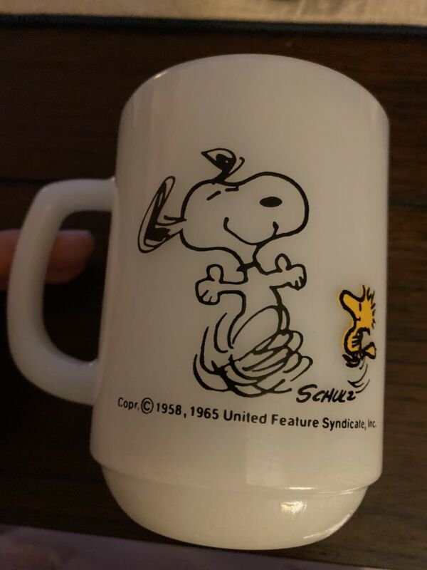 Title (ebay affiliate link): Snoopy Fireking Milk Glass AT TIMES LIFE IS PURE JOY Coffee Cup