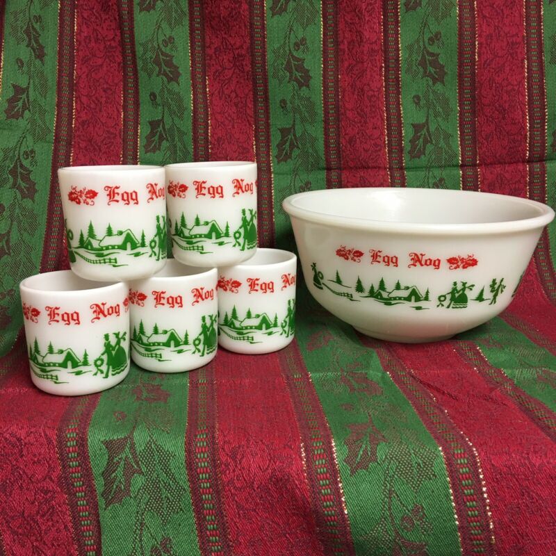 Title (ebay affiliate link): VINTAGE HAZEL ATLAS CHRISTMAS EGG NOG PUNCH BOWL SET Milk Glass BOWL & 5 CUPS