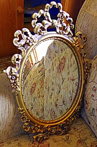 Title (ebay affiliate link): VINTAGE ANTIQUE GOLD ORNATE ROCOCCO STYLE FRAME OVAL WALL MIRROR BOWS/FLORAL 19"