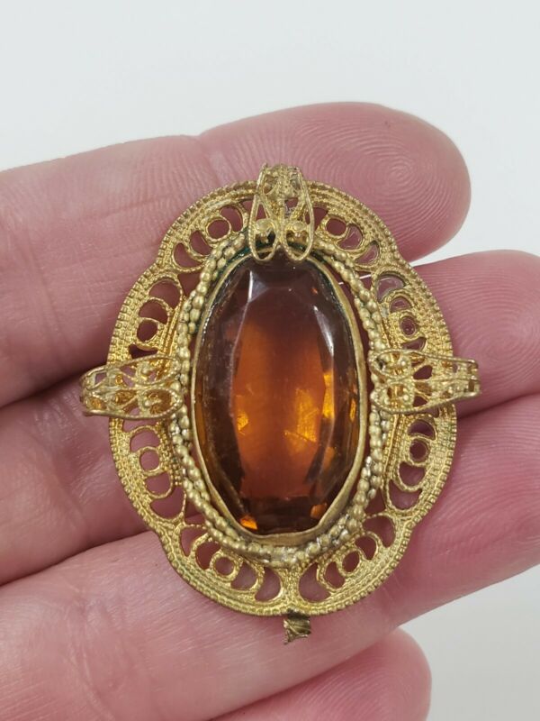Estate Antique Vintage Gold Tone Filigree Amber Glass Pendant 1,5" T