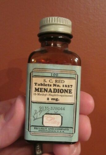 Title (ebay affiliate link): VINTAGE MENADIONE #1627 MEDICINE PHARMACY BOTTLE ELI LILLY CO-2.75" Tall