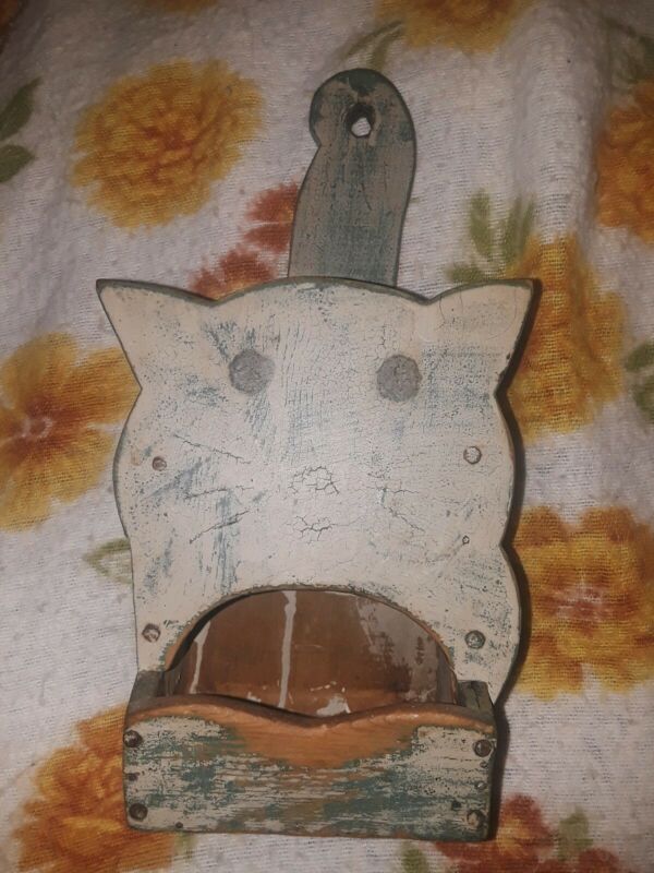 Vintage Unusual Wooden Cat Folk Art Hanging Green Candle Match Box Wallbox