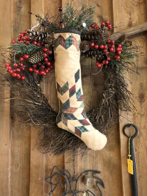 Primitive, Farmhouse Christmas Wreath With Stocking