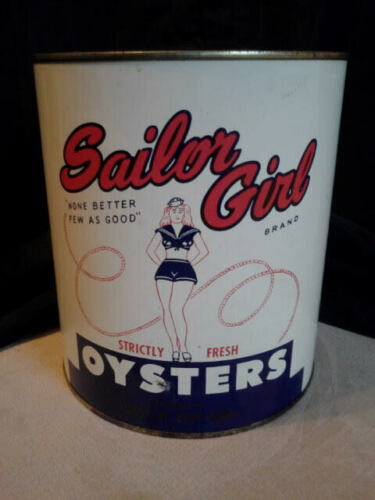 Title (ebay affiliate link): "Rusty Gold" Sailor Girl 1 Gallon Oyster Tin Can made in Chicago, Stamped NJ