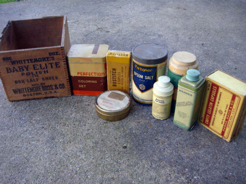 LOT old vintage antique advertising tins etc in Baby Elite Polish wood box