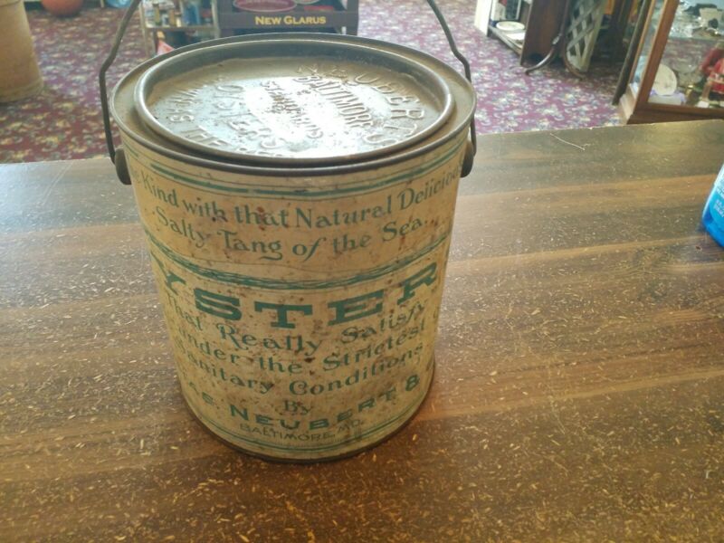 Title (ebay affiliate link): Chas. Neubert & Co. 1gal Oyster Tin, lid and bail Mermaid Graphic Baltimore MD