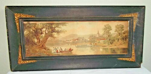 Antique Wood Picture Frame w/ Original Lakeside Print Rowboats Church 18"x8.5"