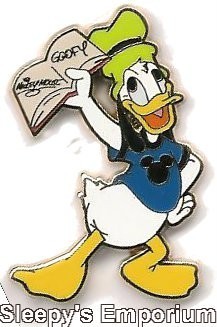 Title (ebay affiliate link): DONALD WITH AN AUTOGRAPH BOOK AND GOOFY HAT Disney Pin
