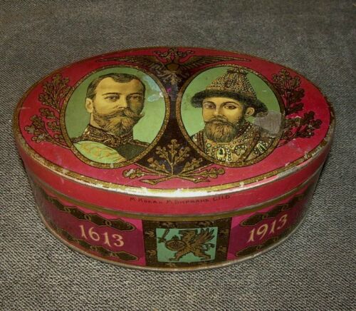 Title (ebay affiliate link): Antique Russian Biscuit Tin ROMANOV DYNASTY 1613 - 1913 Cyrillic Script Purple