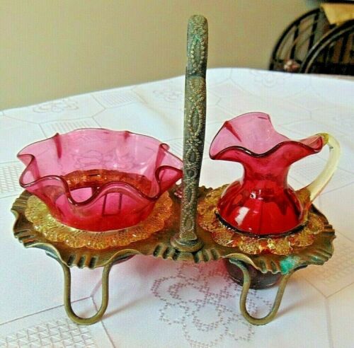 ANTIQUE VICTORIAN CRANBERRY & GREEN GLASS CREAM & SUGAR w SILVER PLATE HOLDER.