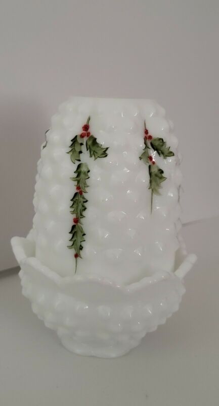 Title (ebay affiliate link): FENTON MILK GLASS HOBNAIL HOLLY BERRY HAND PAINTED & SIGNED FAIRY LIGHT