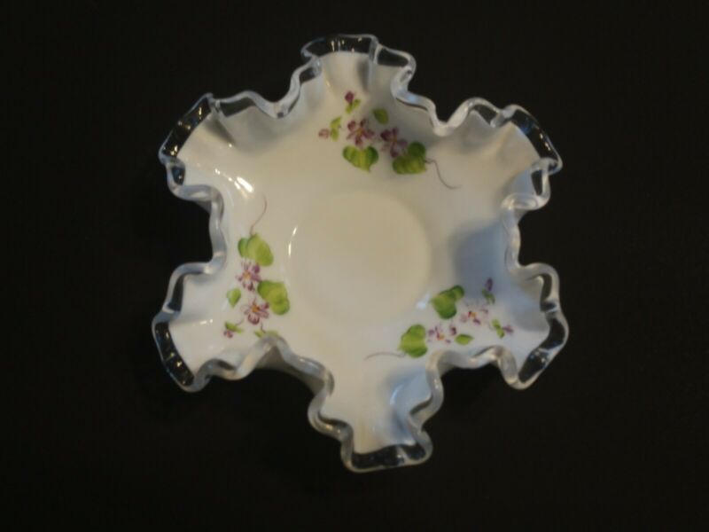 Fenton Milk Glass - silver crested, ruffled candy dish; J. Stevens - artist