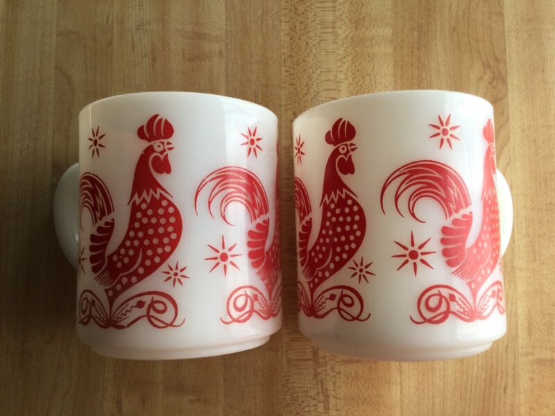 Title (ebay affiliate link): VINTAGE 2 FARM HOUSE RED ROOSTER COFFEE MUGS WHITE MILK GLASS POSS. HAZEL ATLAS