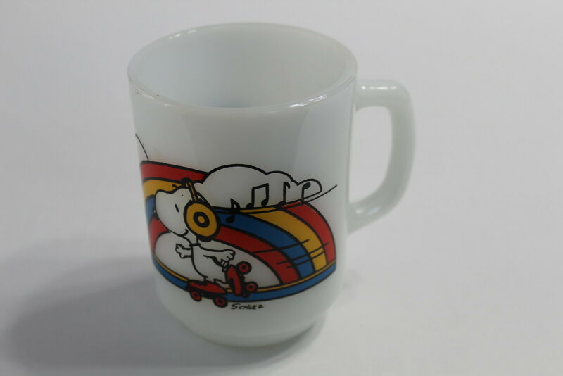 Vintage Anchor Hocking Snoopy The Skater''s Waltz Mug Cup Rainbow Milk Glass EUC