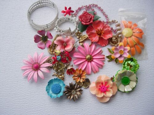 Vintage JUNK jewelry lot enamel flowers brooches milk glass beads PARTS LOT