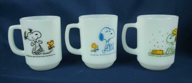 Title (ebay affiliate link): 3 Vintage FIRE KING Snoopy Peanuts Coffee Mugs Cups Milk Glass