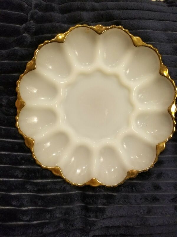 Title (ebay affiliate link): Vtg 12 Round White & Gold Milk Glass Deviled Egg or Oyster Dish