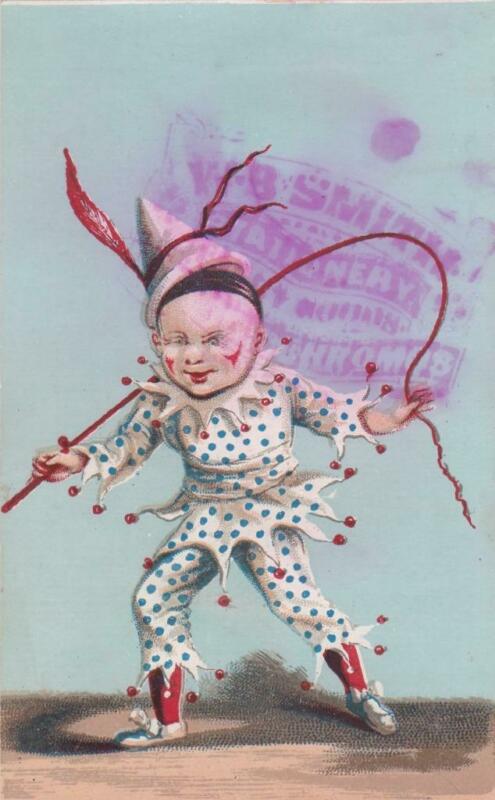 Victorian Trade Card Smith Stationery Clown with Whip & Jingle Bells on Suit (I)