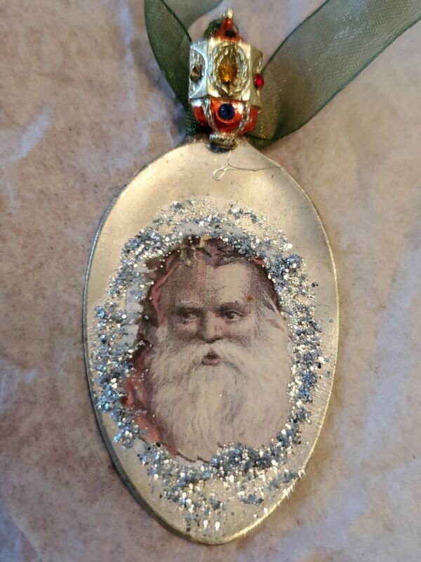 Title (ebay affiliate link): Vintage Silver Spoon Ornament Handmade Christmas Scrap Santa Vintage Materials