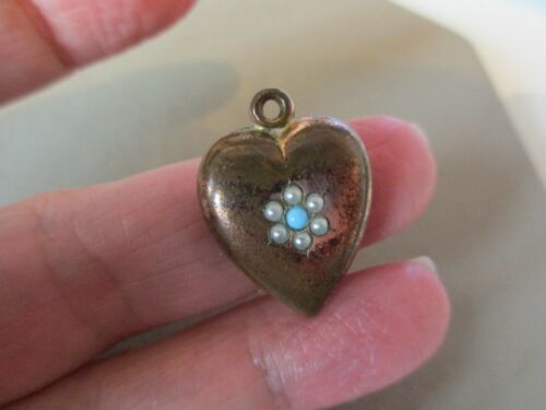 ANTIQUE VINTAGE ART NOUVEAU DECO TURQUOISE PEARL GLASS HEART FOB CHARM PENDANT