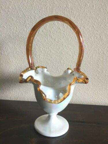 Fenton Pearlized Iridescent Milk Glass iridized gold crest & handle tall basket