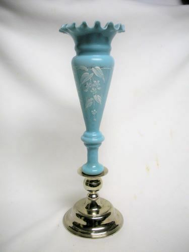 Antique Blue Opaline Milk Glass Trumpet Epergne Vase Victorian Silverplate Base