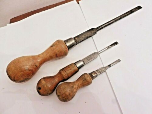 FOUND 3 ANTIQUE WOODEN HANDLED STEEL FLAT HEAD CARPENTERS SCREWDRIVERS