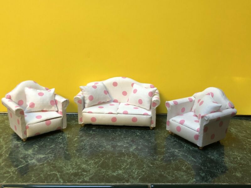 VTG 7 Pc Miniature Dollhouse Fabric Living Room Furniture Sofa Chairs Pillows!