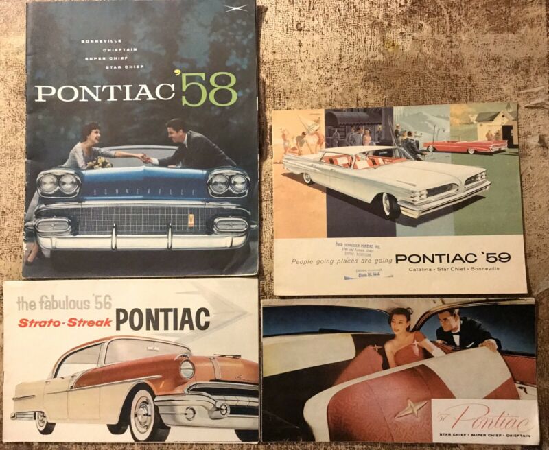 Title (ebay affiliate link): 4 Vintage 1956-1959 Pontiac Car Advertising Foldout Brochures & Booklet