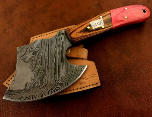 Title (ebay affiliate link): Damascus Steel Axe-Fully Functional-Camping-Heat Treated-Sheath-Dh165