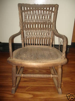 Title (ebay affiliate link): ANTIQUE HEYWOOD CHILDS WICKER CANE SEAT ROCKING CHAIR
