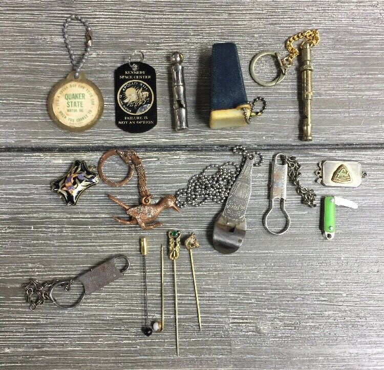Title (ebay affiliate link): VINTAGE ANTIQUE Key-Chain Lot (Kennedy Space Center, Quaker State)
