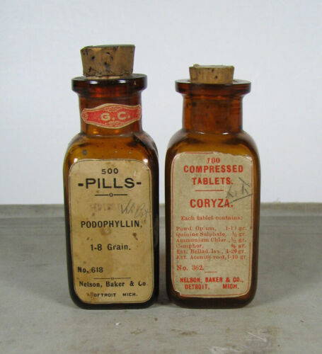 Title (ebay affiliate link): 2 Handblown Amber small NELSON, BAKER & CO. pharmaceutical bottles DETROIT MICH