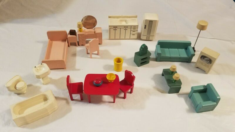 Title (ebay affiliate link): VINTAGE MINIATURE DOLL HOUSE WOOD FURNITURE LOT BEDROOM LIVING ROOM BATHROOM