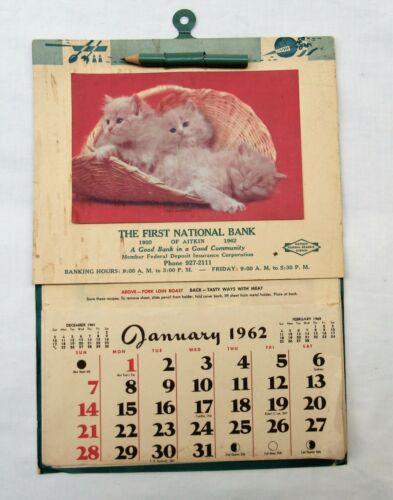 Title (ebay affiliate link): Vintage 1960s Kitten Calendar 1962 small recipe pockets Aitkin Minnesota unused