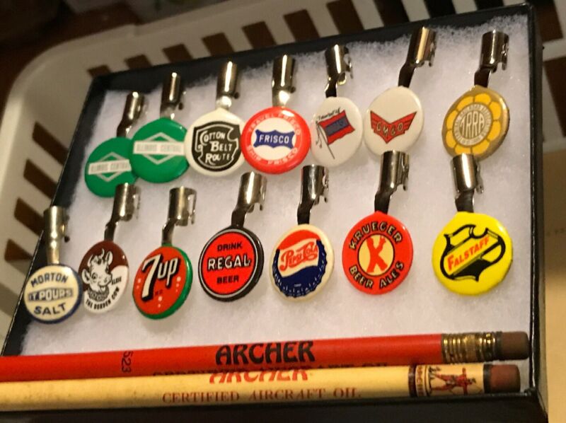 Title (ebay affiliate link): Vintage Advertising Pen Pencil Pocket Clip Holder Collection Beer Soda Railroad