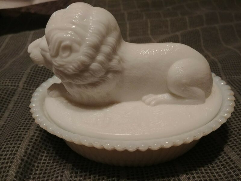 Antique Milk Glass Lion Covered Candy Dish