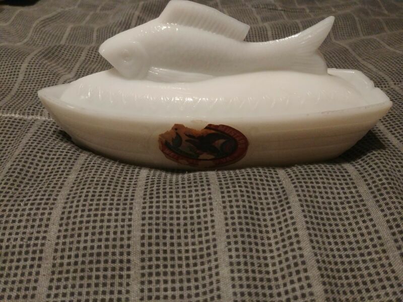Vintage eagle Milk Glass Fish/boat Covered Dish With Label. Mustard