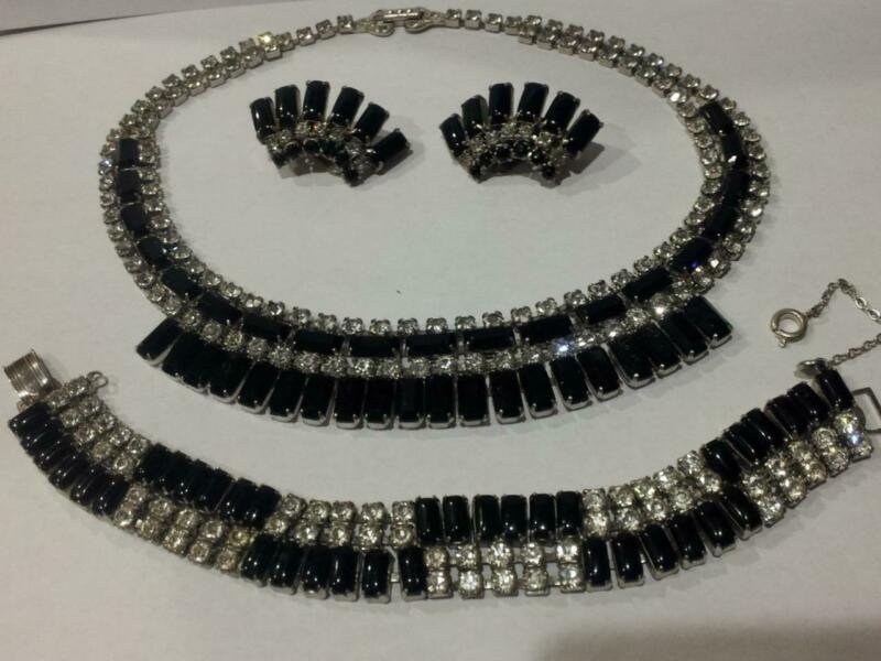 Title (ebay affiliate link): VTG~1950''S PIANO KEY''S RHINESTONE NECKLACE BRACELET W SAFETY CHAIN & EARRING SET