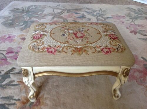 Vintage Floral Needlepoint Foot Stool White French Provincial Wood