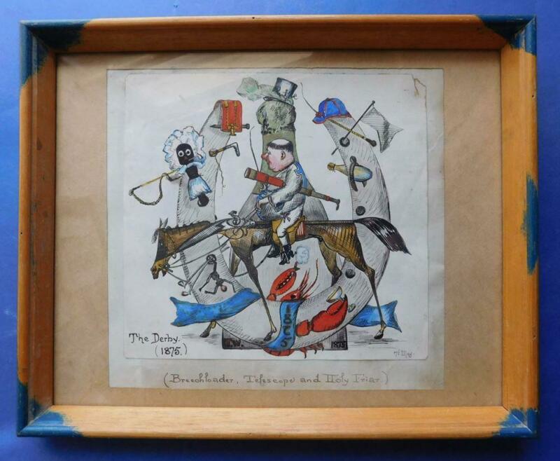 Orig drawing Satirical Cartoon 1875 ''The Derby'' Breechloader Telescope & Friar