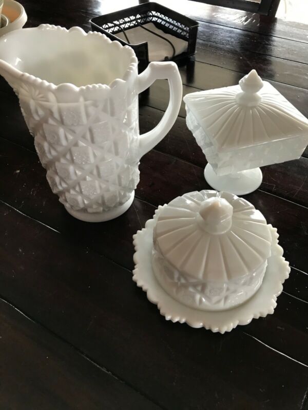 Title (ebay affiliate link): Westmoreland milk glass quilt pattern three pieces in excellent condition
