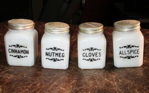 Title (ebay affiliate link): 4 Vintage Milk Glass Spice Jars Cinnamon Cloves Allspice Nutmeg Lids Dove Brand