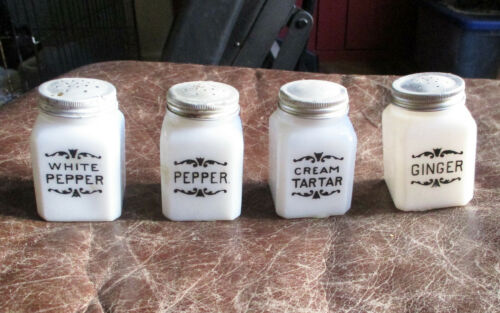 Title (ebay affiliate link): 4 Vintage Milk Glass Spice Jars Ginger Cream Tartar White Pepper Lid White Villa