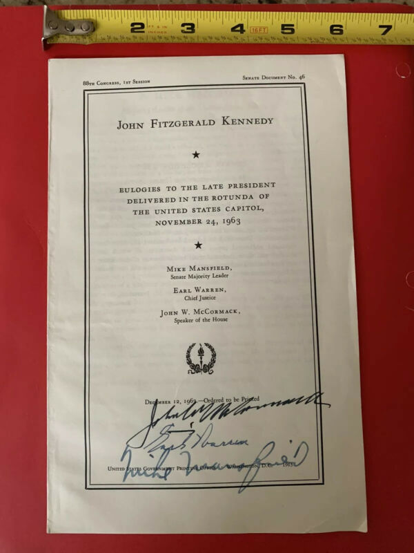 Title (ebay affiliate link): AUTOGRAPHS OF JUSTICE WARREN, SEN. MANSFIELD & SPEAKER MACCORMACK ON JFK EULOGY