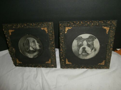 2 Antique Ornate Black Gold Wooden Picture Frames w/ Dogs