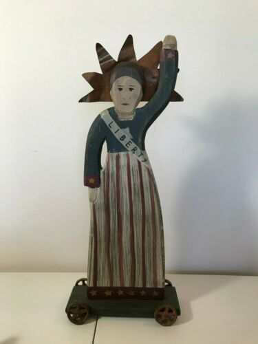 Title (ebay affiliate link): VINTAGE FOLK ART WOOD LADY LIBERTY PATRIOTIC DECOR ON WHEELS CART WOODEN